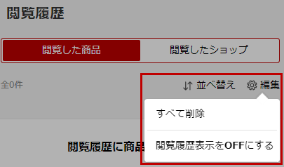 閲覧履歴が正常に利用できない以下をご確認ください。 「閲覧履歴表示をOFF」に設定したが閲覧履歴が出てしまう、または「閲覧履歴をONにする」に設定したが閲覧履歴が消されてしまう 最近チェックした商品やショップの閲覧履歴は、ログイン済みとログイン前で別々に管理されています。